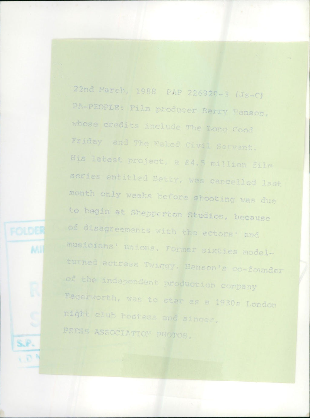 1988 - FILM PRODUCER BARRY HANSON MARCH PAP, ACTRESS, MODEL 1988 - FILM PRODUCER BARRY HANSON MARCH PAP, ACTRESS, MODEL