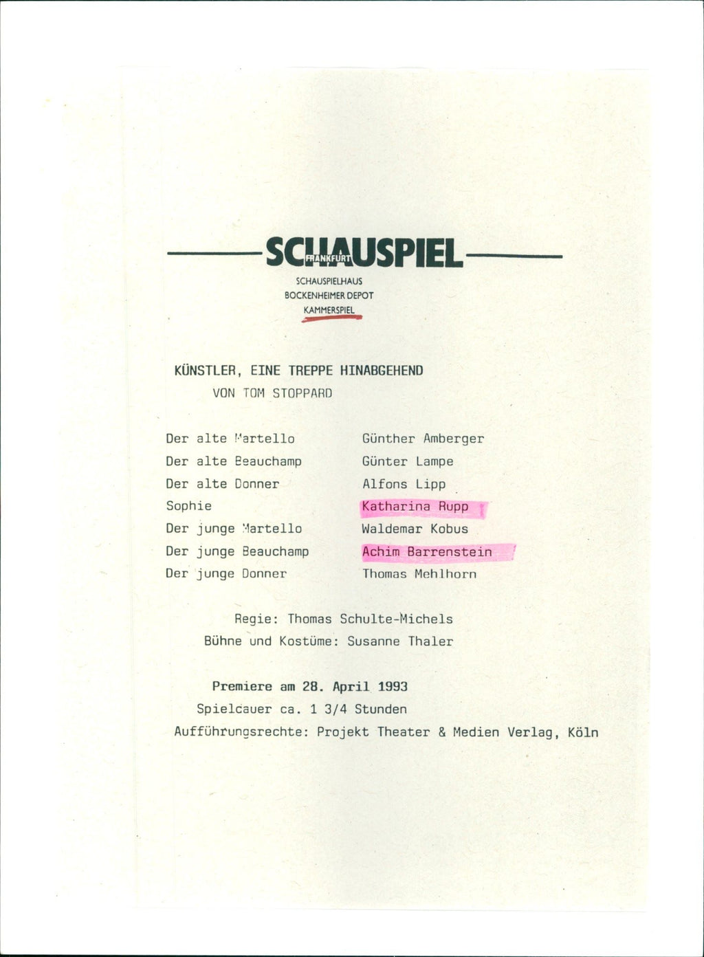 1993 URBAN ISTUCKE YOUNG THUNDER GERMAN FILM DIRECTED THOMAS PREMIERE Katharina Rupp und Achim Barrenstein in "Künstler, eine Treppe hinabgehend" im Schauspiel Frankfurt.