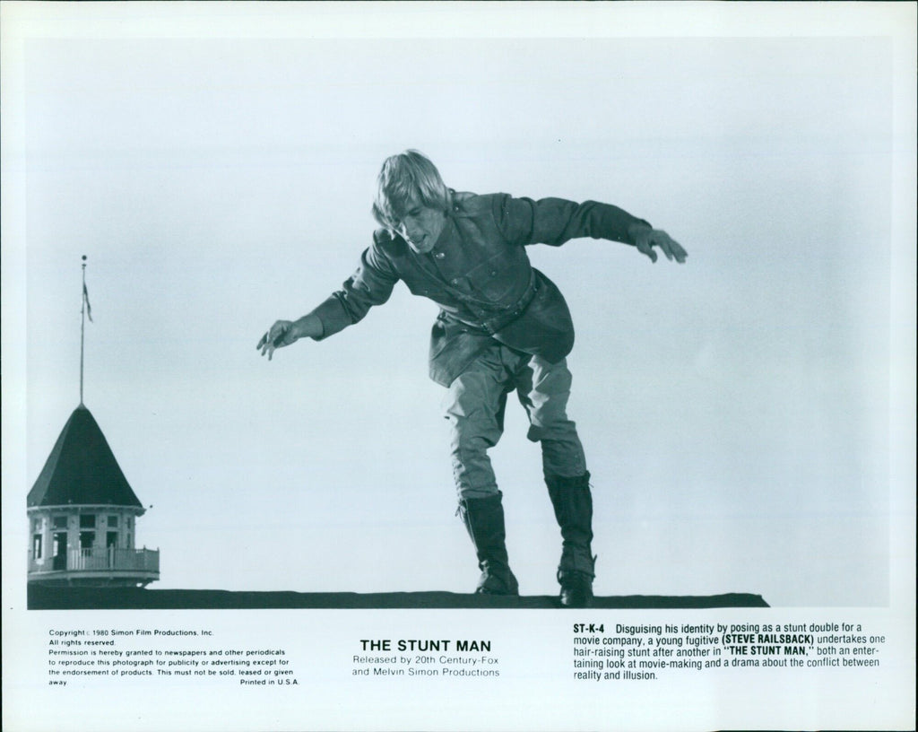 Steve Railsback is seen in the 1980 film "The Stunt Man," playing a young fugitive who disguises his identity by posing as a stunt double for a movie company. The film is an entertaining look at movie-making, as well as a drama about the conflict between reality and illusion. It opened at the United Artists Theater on July 11, 1980. Steve Railsback is seen in the 1980 film "The Stunt Man," playing a young fugitive who disguises his identity by posing as a stunt double for a movie company. The film is an entertaining look at movie-making, as well as a drama about the conflict between reality and illusion. It opened at the United Artists Theater on July 11, 1980.