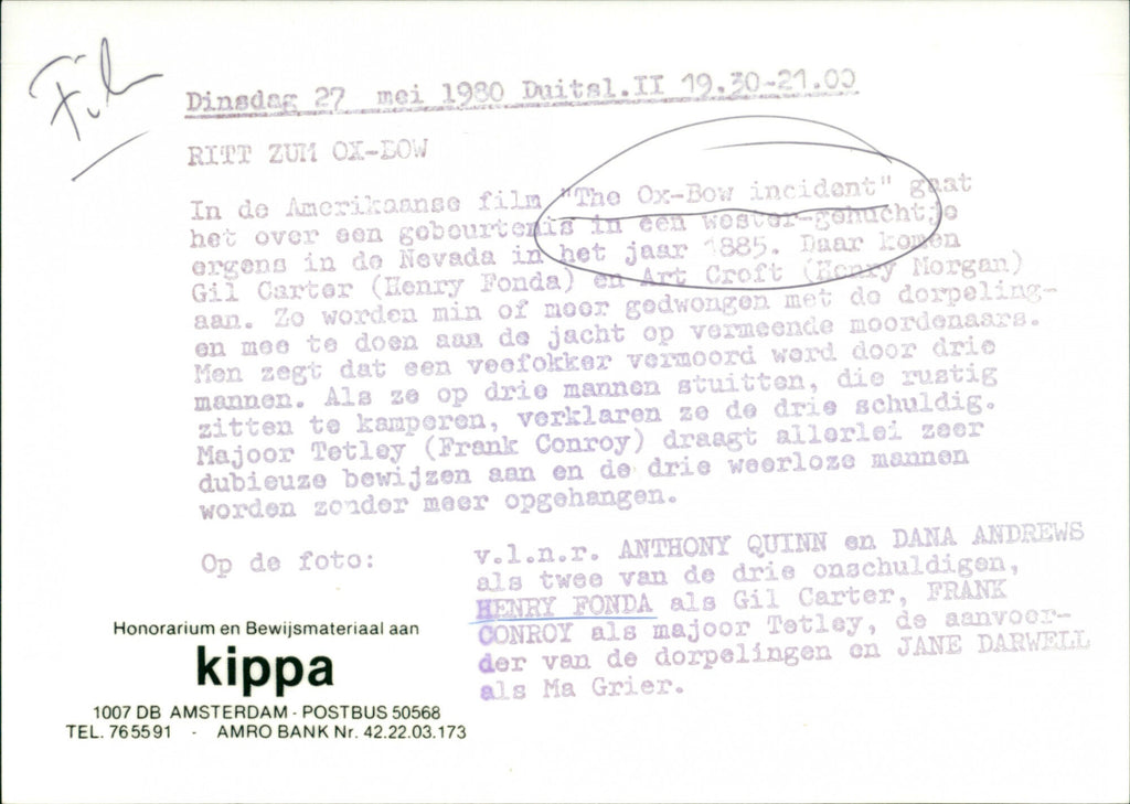 English: A scene from the movie "The Ox-Bow Incident" featuring, from left to right, Anthony Quinn and Dana Andrews as two of the three innocents, Henry Fonda as Gil Cater, Frank Conroy as Major Tetley who is also the leader of the townspeople, and Jane Darwell as Ma Grier. Dutch: Een scène uit de film "The Ox-Bow Incident" met, van links naar rechts, Anthony Quinn en Dana Andrews als twee van de drie onschuldigen, Henry Fonda als Gil Cater, Frank Conroy als majoor Tetley die ook de leider van de dorpelingen is, en Jane Darwell als Ma Grier. English: A scene from the movie "The Ox-Bow Incident" featuring, from left to right, Anthony Quinn and Dana Andrews as two of the three innocents, Henry Fonda as Gil Cater, Frank Conroy as Major Tetley who is also the leader of the townspeople, and Jane Darwell as Ma Grier. Dutch: Een scène uit de film "The Ox-Bow Incident" met, van links naar rechts, Anthony Quinn en Dana Andrews als twee van de drie onschuldigen, Henry Fonda als Gil Cater, Frank Conroy als majoor Tetley die ook de leider van de dorpelingen is, en Jane Darwell als Ma Grier.