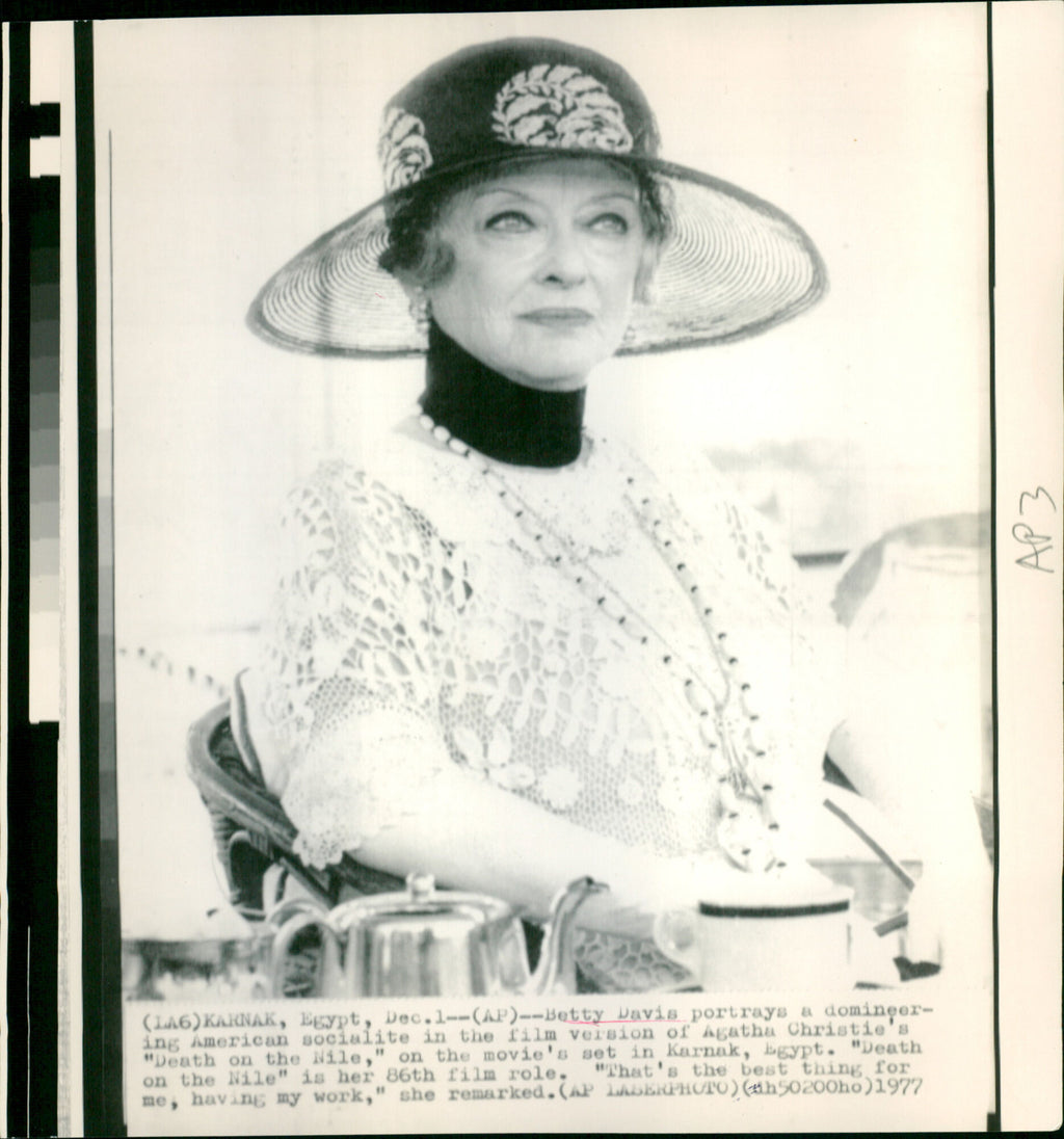 Bette Davis portrays a domineering American socialite in the film version of Agatha Christie's "Death on the Nile," on the movie's set in Karnak. Bette Davis portrays a domineering American socialite in the film version of Agatha Christie's "Death on the Nile," on the movie's set in Karnak.