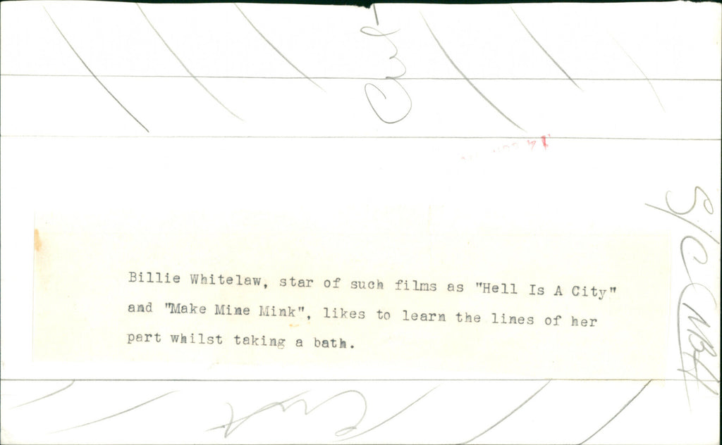 Billie Whitelaw, star of such films as "Hell Is A City" and "Make Mine Mink", likes to learn the lines of her part whilst taking a bath. Billie Whitelaw, star of such films as "Hell Is A City" and "Make Mine Mink", likes to learn the lines of her part whilst taking a bath.
