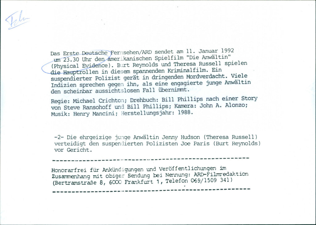English: Burt Reynolds as Joe Paris and Theresa Russell as Jenny Hudson in the 1988 movie "Physical Evidence". Dutch: Burt Reynolds als Joe Paris en Theresa Russell als Jenny Hudson in de film "Physical Evidence" uit 1988. English: Burt Reynolds as Joe Paris and Theresa Russell as Jenny Hudson in the 1988 movie "Physical Evidence". Dutch: Burt Reynolds als Joe Paris en Theresa Russell als Jenny Hudson in de film "Physical Evidence" uit 1988.