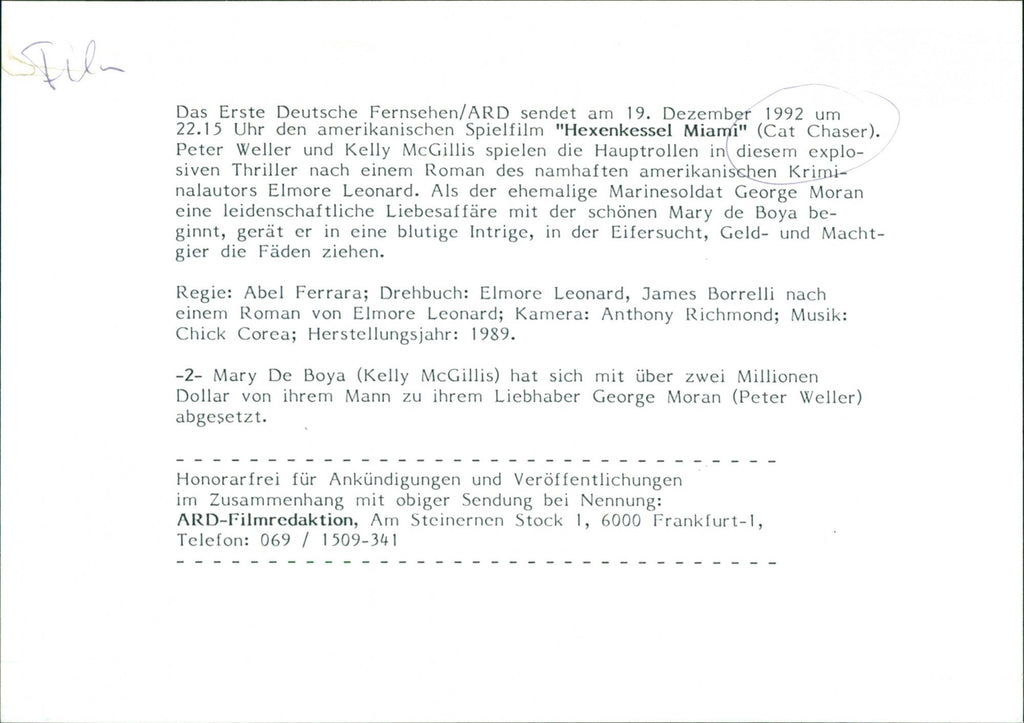 ENG: Cat Chaser is a 1989 American heist film directed by Abel Ferrara and starring Peter Weller and Kelly McGillis, based on the 1982 novel of the same name DUTCH: Cat Chaser is een Amerikaanse overvalfilm uit 1989, geregisseerd door Abel Ferrara en met in de hoofdrollen Peter Weller en Kelly McGillis, gebaseerd op de gelijknamige roman uit 1982. ENG: Cat Chaser is a 1989 American heist film directed by Abel Ferrara and starring Peter Weller and Kelly McGillis, based on the 1982 novel of the same name DUTCH: Cat Chaser is een Amerikaanse overvalfilm uit 1989, geregisseerd door Abel Ferrara en met in de hoofdrollen Peter Weller en Kelly McGillis, gebaseerd op de gelijknamige roman uit 1982.