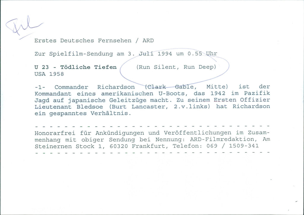 English: A scene from the 1958 movie "Run Silent, Run Deep" in which Commander Richardson (Clark Gable, center) is the commander of an American submarine hunting Japanese escort ships in the Pacific in 1942. Richardson has a strained relationship with his first officer, Lieutenant Bledsoe (Burt Lancaster, 2nd from left). Dutch: Een scène uit de film "Run Silent, Run Deep" uit 1958 waarin commandant Richardson (Clark Gable, midden) de commandant is van een Amerikaanse onderzeeër die op Japanse escorteschepen in de Stille Oceaan jaagt in 1942. Richardson heeft een gespannen relatie met zijn eerste officier, luitenant Bledsoe (Burt Lancaster, 2e van links). English: A scene from the 1958 movie "Run Silent, Run Deep" in which Commander Richardson (Clark Gable, center) is the commander of an American submarine hunting Japanese escort ships in the Pacific in 1942. Richardson has a strained relationship with his first officer, Lieutenant Bledsoe (Burt Lancaster, 2nd from left). Dutch: Een scène uit de film "Run Silent, Run Deep" uit 1958 waarin commandant Richardson (Clark Gable, midden) de commandant is van een Amerikaanse onderzeeër die op Japanse escorteschepen in de Stille Oceaan jaagt in 1942. Richardson heeft een gespannen relatie met zijn eerste officier, luitenant Bledsoe (Burt Lancaster, 2e van links).