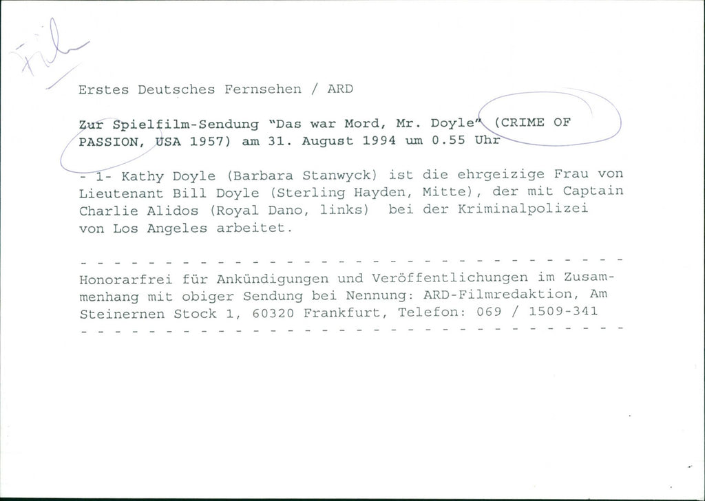 ENG: Crime of Passion Barbara Stanwyck as Kathy Ferguson Doyle · Sterling Hayden as Police Lieutenant Bill Doyle DUTCH: Crime of Passion Barbara Stanwyck als Kathy Ferguson Doyle · Sterling Hayden als politieluitenant Bill Doyle ENG: Crime of Passion Barbara Stanwyck as Kathy Ferguson Doyle · Sterling Hayden as Police Lieutenant Bill Doyle DUTCH: Crime of Passion Barbara Stanwyck als Kathy Ferguson Doyle · Sterling Hayden als politieluitenant Bill Doyle