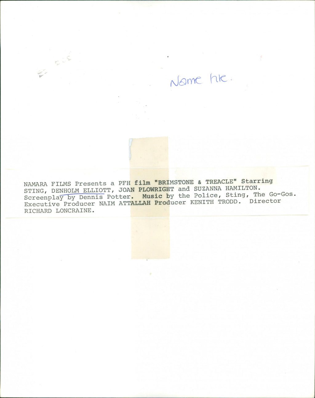 Namara Films presents a PFH film "Brimstone & Treacle" starring Sting, Denholm Elliott, Joan Plowright and Suzanna Hamilton. Screenplay by Dennis Potter. Music by The Police, Sting, The Go-Gos. Director Richard Loncraine. Namara Films presents a PFH film "Brimstone & Treacle" starring Sting, Denholm Elliott, Joan Plowright and Suzanna Hamilton. Screenplay by Dennis Potter. Music by The Police, Sting, The Go-Gos. Director Richard Loncraine.