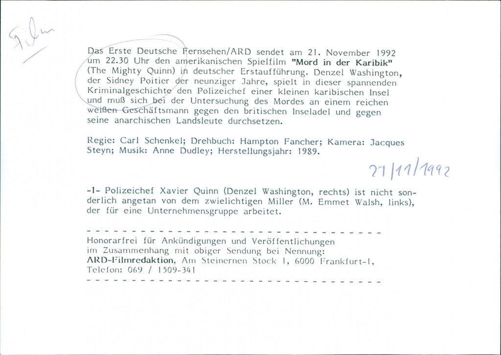 English: Denzel Washington as Chief of police Xavier Quinn and M. Emmet Walsh as Miller (left) in the movie "The Mighty Quinn". Dutch: Denzel Washington als politiechef Xavier Quinn en M. Emmet Walsh als Miller (links) in de film "The Mighty Quinn". English: Denzel Washington as Chief of police Xavier Quinn and M. Emmet Walsh as Miller (left) in the movie "The Mighty Quinn". Dutch: Denzel Washington als politiechef Xavier Quinn en M. Emmet Walsh als Miller (links) in de film "The Mighty Quinn".
