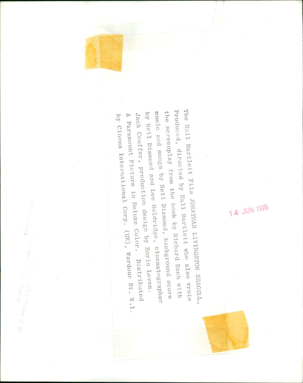 On June 14, 1976, Hall Bartlett's film adaptation of Richard Bach's novel Jonathan Livingston Seagull was released. The movie was produced, directed, and written by Bartlett, with music and songs by Neil Diamond and a background score by Neil Diamond and Lee Holdridge. Cinematographer Jack Couffer and production designer Boris Leven contributed to the film, which was released by Paramount Pictures in Deluxe Color and distributed by Cinema International Corp. (UK) and Wardour St. W.1. Lep (U.K.) Wardour St. W. On June 14, 1976, Hall Bartlett's film adaptation of Richard Bach's novel Jonathan Livingston Seagull was released. The movie was produced, directed, and written by Bartlett, with music and songs by Neil Diamond and a background score by Neil Diamond and Lee Holdridge. Cinematographer Jack Couffer and production designer Boris Leven contributed to the film, which was released by Paramount Pictures in Deluxe Color and distributed by Cinema International Corp. (UK) and Wardour St. W.1. Lep (U.K.) Wardour St. W.