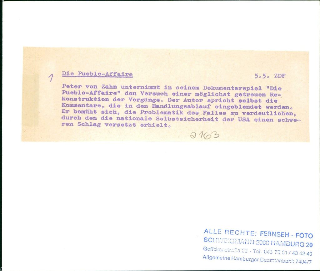 HARVEY BUCHER PETER VON ZAHN HIS DOCUMENTARY GAME PUEBLO AFFAIR NAVY Peter von Zahn unternimmt in seinem Dokumentarspiel "Die Pueblo-Affaire" den Versuch einer möglichst getreuen Rekonstruktion der Vorgänge.