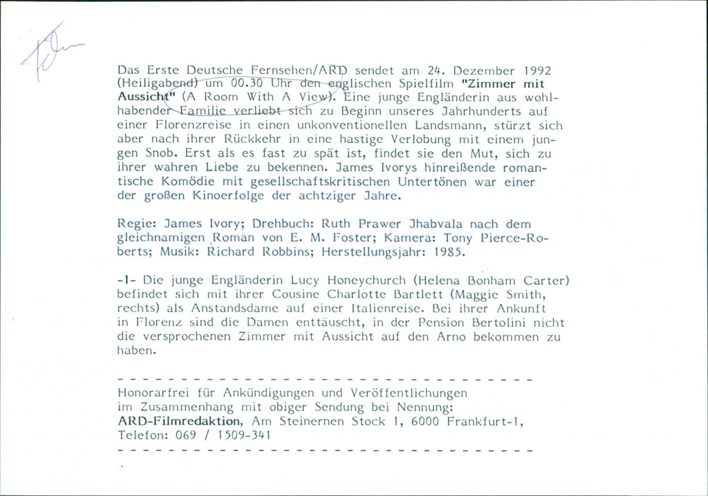 English: The 1985 movie "A Room with a View". Young Englishwoman Lucy Honeychurch (Helena Bonham Carter) is on a trip to Italy with her cousin Charlotte Bartlett (Maggie Smith, right) as a chaperone. Upon their arrival at the Bertolini Pension in Florence, the ladies are disappointed that they did not receive a room with a view of the Arno River as they were promised. Dutch: De film "A Room with a View" uit 1985. De jonge Engelse Lucy Honeychurch (Helena Bonham Carter) is op reis naar Italië met haar nicht Charlotte Bartlett (Maggie Smith, rechts) als chaperonne. Bij hun aankomst in het Bertolini Pension in Florence zijn de dames teleurgesteld dat ze geen kamer hebben gekregen met uitzicht op de Arno rivier, zoals hen was beloofd. English: The 1985 movie "A Room with a View". Young Englishwoman Lucy Honeychurch (Helena Bonham Carter) is on a trip to Italy with her cousin Charlotte Bartlett (Maggie Smith, right) as a chaperone. Upon their arrival at the Bertolini Pension in Florence, the ladies are disappointed that they did not receive a room with a view of the Arno River as they were promised. Dutch: De film "A Room with a View" uit 1985. De jonge Engelse Lucy Honeychurch (Helena Bonham Carter) is op reis naar Italië met haar nicht Charlotte Bartlett (Maggie Smith, rechts) als chaperonne. Bij hun aankomst in het Bertolini Pension in Florence zijn de dames teleurgesteld dat ze geen kamer hebben gekregen met uitzicht op de Arno rivier, zoals hen was beloofd.