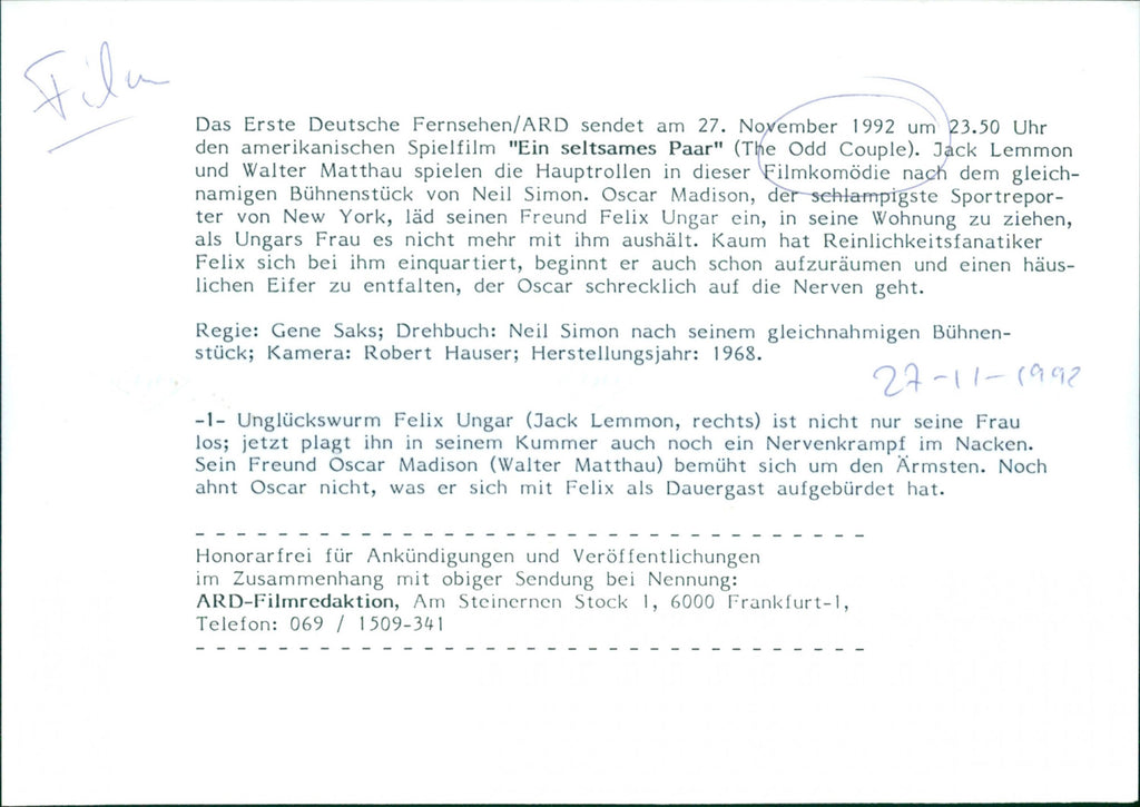 English: Jack Lemmon as Felix Ungar (right) and Walter Matthau as Felix's friend Oscar Madison in a scene from the 1968 movie "The Odd Couple". Dutch: Jack Lemmon als Felix Ungar (rechts) en Walter Matthau als Felix' vriend Oscar Madison in een scène uit de film "The Odd Couple" uit 1968. English: Jack Lemmon as Felix Ungar (right) and Walter Matthau as Felix's friend Oscar Madison in a scene from the 1968 movie "The Odd Couple". Dutch: Jack Lemmon als Felix Ungar (rechts) en Walter Matthau als Felix' vriend Oscar Madison in een scène uit de film "The Odd Couple" uit 1968.