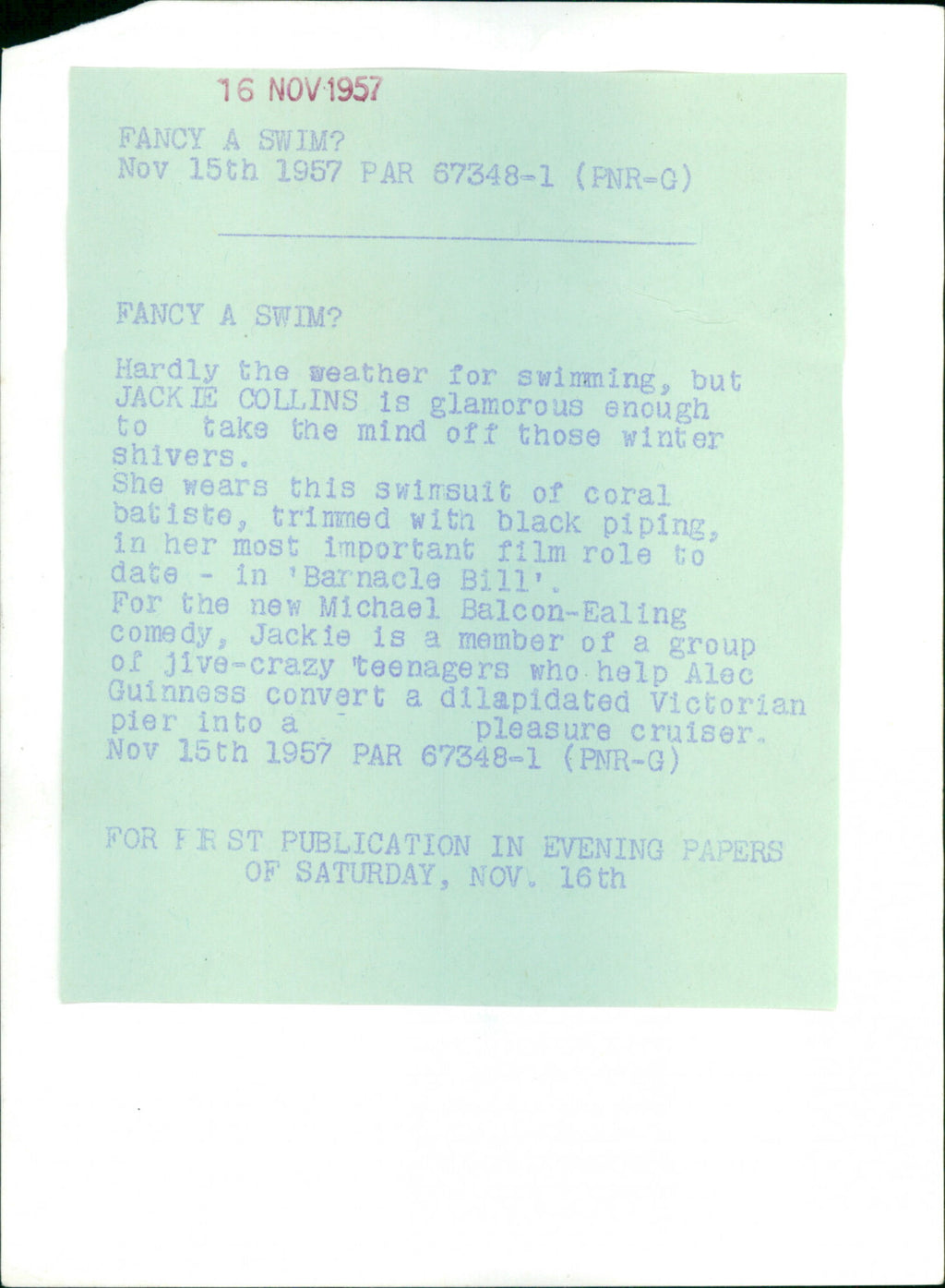 Fancy a swim? Hardly the weather for swimming, but Jackie Collins is glamorous enough to take the mind off those winter shivers. She wears this swimsuit of coral batiste, trimmed with black piping, in her most important film role to date - in "Barnacle Bill." Fancy a swim? Hardly the weather for swimming, but Jackie Collins is glamorous enough to take the mind off those winter shivers. She wears this swimsuit of coral batiste, trimmed with black piping, in her most important film role to date - in "Barnacle Bill."