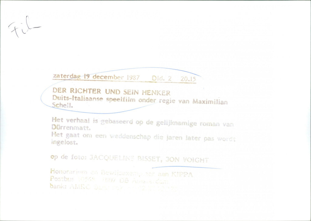 English: Jacqueline Bisset and Jon Voight in the movie "Der Richter und sein Henker". the movie is based on the novel of the same name by Dürrenmatt. Dutch: Jacqueline Bisset en Jon Voight in de film "Der Richter und sein Henker". De film is gebaseerd op de gelijknamige roman van Dürrenmatt. English: Jacqueline Bisset and Jon Voight in the movie "Der Richter und sein Henker". the movie is based on the novel of the same name by Dürrenmatt. Dutch: Jacqueline Bisset en Jon Voight in de film "Der Richter und sein Henker". De film is gebaseerd op de gelijknamige roman van Dürrenmatt.