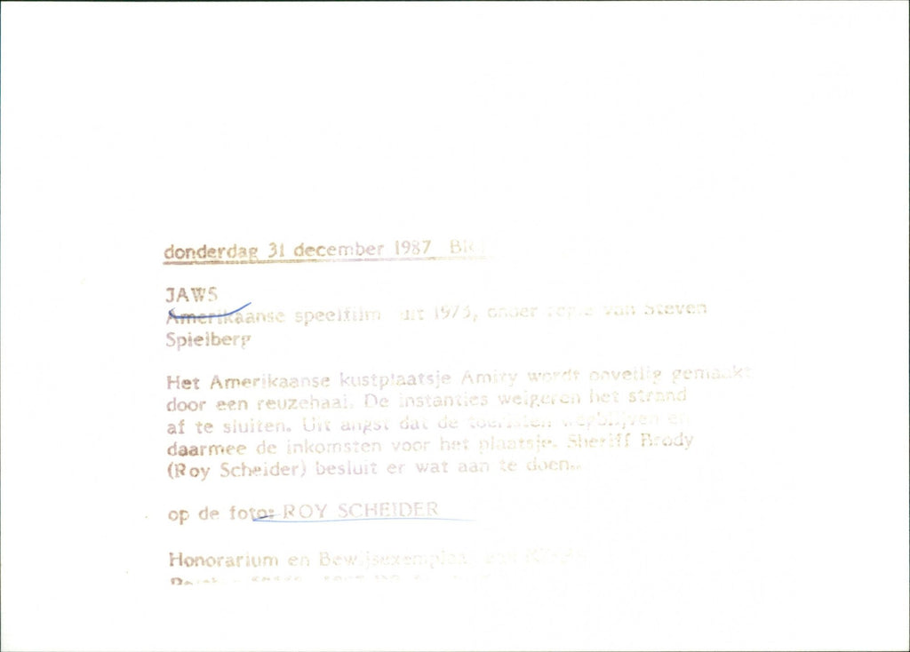 English: Roy Scheider as Sheriff Martin Brody in the movie "Jaws". French: Roy Scheider dans le rôle du shérif Martin Brody dans le film "Jaws". Dutch: Roy Scheider als Sheriff Martin Brody in de film "Jaws" English: Roy Scheider as Sheriff Martin Brody in the movie "Jaws". French: Roy Scheider dans le rôle du shérif Martin Brody dans le film "Jaws". Dutch: Roy Scheider als Sheriff Martin Brody in de film "Jaws"