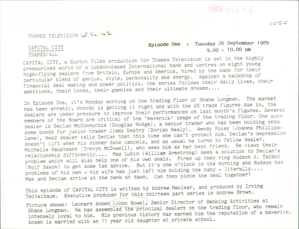 Movie set photo of actor John Bowe in "Capital City". Movie set photo of actor John Bowe in "Capital City".