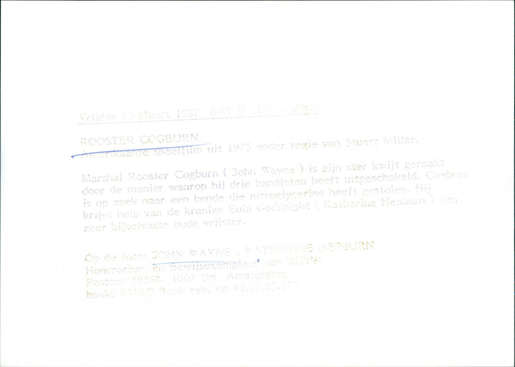 English: John Wayne as Marshal Rooster Cogburn and Katharine Hepburn as Eula Goodnight in the 1975 movie "Rooster Cogburn". Dutch: John Wayne als marshal Rooster Cogburn en Katharine Hepburn als Eula Goodnight in de film "Rooster Cogburn" uit 1975. English: John Wayne as Marshal Rooster Cogburn and Katharine Hepburn as Eula Goodnight in the 1975 movie "Rooster Cogburn". Dutch: John Wayne als marshal Rooster Cogburn en Katharine Hepburn als Eula Goodnight in de film "Rooster Cogburn" uit 1975.