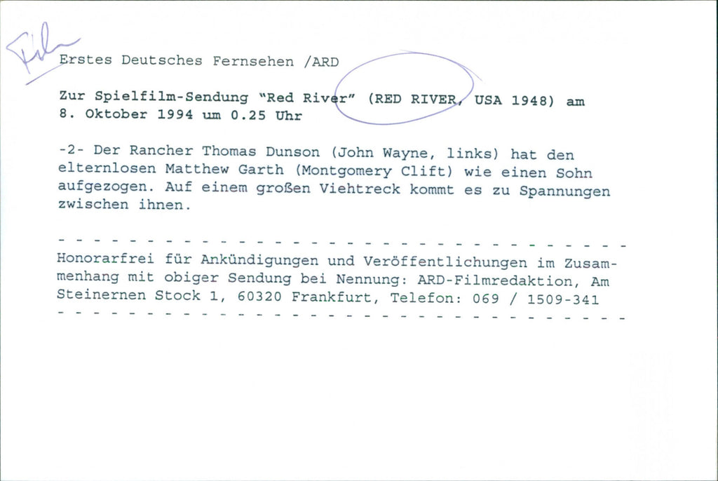 English: The 1948 movie "Red River". Rancher Thomas Dunson (John Wayne, left) has raised the parentless Matthew Garth (Montgomery Clift) like a son. Tensions arise between them over a large cattle drive. Dutch: De film "Red River" uit 1948. Rancher Thomas Dunson (John Wayne, links) heeft de ouderloze Matthew Garth (Montgomery Clift) opgevoed als een zoon. Er ontstaan spanningen tussen hen over een grote veedrijftocht. English: The 1948 movie "Red River". Rancher Thomas Dunson (John Wayne, left) has raised the parentless Matthew Garth (Montgomery Clift) like a son. Tensions arise between them over a large cattle drive. Dutch: De film "Red River" uit 1948. Rancher Thomas Dunson (John Wayne, links) heeft de ouderloze Matthew Garth (Montgomery Clift) opgevoed als een zoon. Er ontstaan spanningen tussen hen over een grote veedrijftocht.