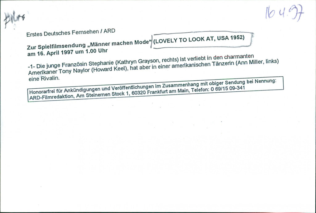 English: Kathryn Grayson as Stephanie (right), Howard Keel as Tony Naylor and Ann Miller as an American dancer (left) in the movie "Lovely to Look At". Dutch: Kathryn Grayson als Stephanie (rechts), Howard Keel als Tony Naylor en Ann Miller als een Amerikaanse danseres (links) in de film "Lovely to Look At". English: Kathryn Grayson as Stephanie (right), Howard Keel as Tony Naylor and Ann Miller as an American dancer (left) in the movie "Lovely to Look At". Dutch: Kathryn Grayson als Stephanie (rechts), Howard Keel als Tony Naylor en Ann Miller als een Amerikaanse danseres (links) in de film "Lovely to Look At".