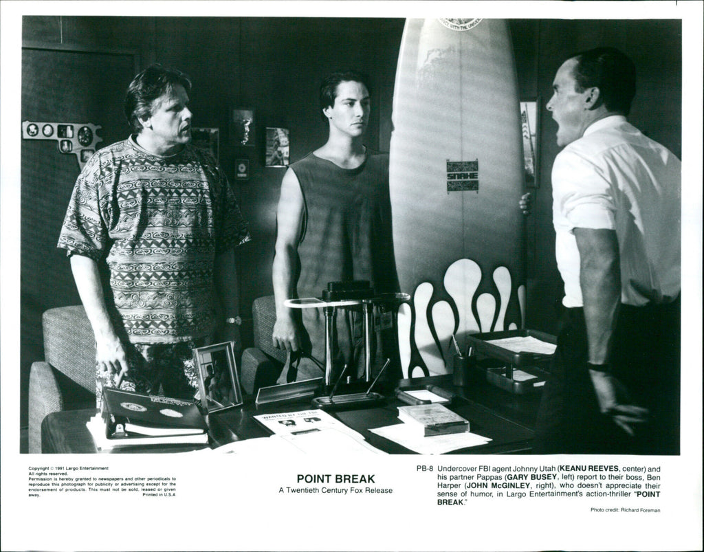 English: Keanu Reeves as undercover FBI agent Johnny Utah (center), Gary Busey as Johnny's partner Pappas (left) and John McGinley as their boss Ben Harper (right) in a scene from the movie "Point Break". Dutch: Keanu Reeves als undercover FBI-agent Johnny Utah (midden), Gary Busey als Johnny's partner Pappas (links) en John McGinley als hun baas Ben Harper (rechts) in een scène uit de film "Point Break". English: Keanu Reeves as undercover FBI agent Johnny Utah (center), Gary Busey as Johnny's partner Pappas (left) and John McGinley as their boss Ben Harper (right) in a scene from the movie "Point Break". Dutch: Keanu Reeves als undercover FBI-agent Johnny Utah (midden), Gary Busey als Johnny's partner Pappas (links) en John McGinley als hun baas Ben Harper (rechts) in een scène uit de film "Point Break".