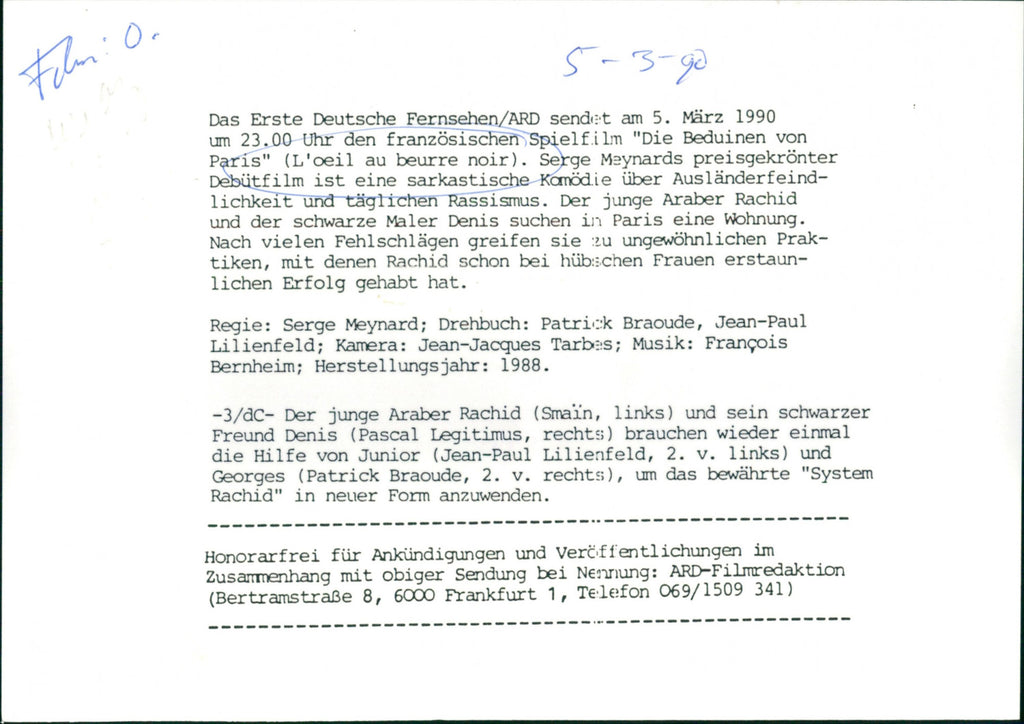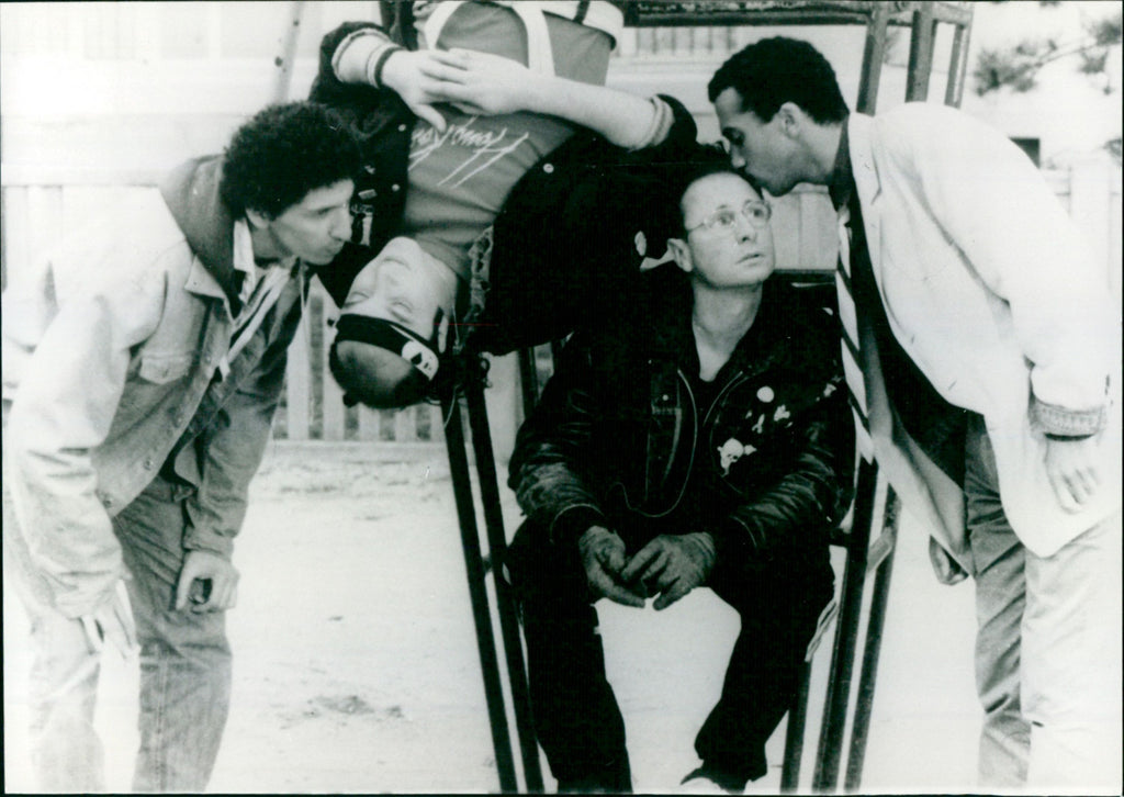 English: The 1988 movie "L'oeil au beurre noir". Rachid (Smaïn, left) and his friend Denis (Pascal Legitimus, right) once again need help from Junior (Jean-Paul Lilienfeld, 2nd from left) and Georges (Patrick Braoude, 2nd from right) to apply the preserved "Rachid System" in a new form. Dutch: De film "L'oeil au beurre noir" uit 1988. Rachid (Smaïn, links) en zijn vriend Denis (Pascal Legitimus, rechts) hebben opnieuw de hulp nodig van Junior (Jean-Paul Lilienfeld, 2e van links) en Georges (Patrick Braoude, 2e van rechts) om het bewaarde "Rachid Systeem" in een nieuwe vorm toe te passen. English: The 1988 movie "L'oeil au beurre noir". Rachid (Smaïn, left) and his friend Denis (Pascal Legitimus, right) once again need help from Junior (Jean-Paul Lilienfeld, 2nd from left) and Georges (Patrick Braoude, 2nd from right) to apply the preserved "Rachid System" in a new form. Dutch: De film "L'oeil au beurre noir" uit 1988. Rachid (Smaïn, links) en zijn vriend Denis (Pascal Legitimus, rechts) hebben opnieuw de hulp nodig van Junior (Jean-Paul Lilienfeld, 2e van links) en Georges (Patrick Braoude, 2e van rechts) om het bewaarde "Rachid Systeem" in een nieuwe vorm toe te passen.