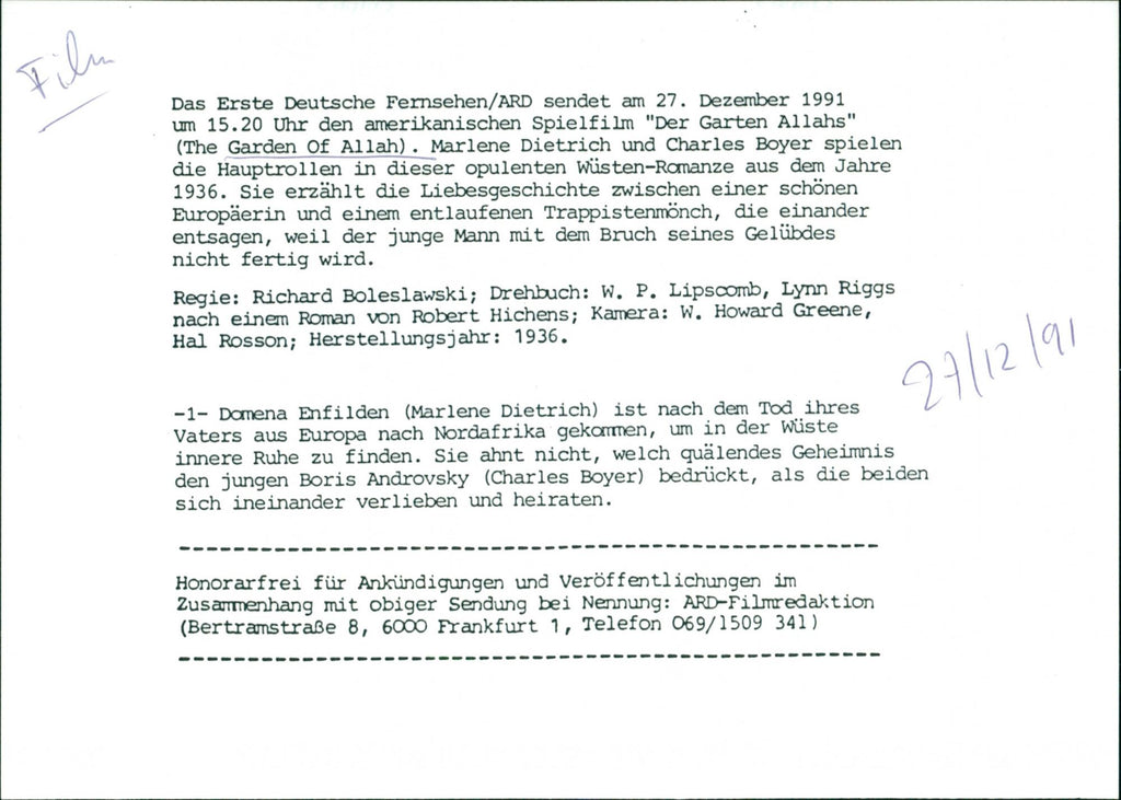 English: Marlene Dietrich as Domena Enfilden and Charles Boyer as Boris Androvsky in a scene from the movie "The Garden of Allah". Dutch: Marlene Dietrich als Domena Enfilden en Charles Boyer als Boris Androvsky in een scène uit de film "The Garden of Allah". English: Marlene Dietrich as Domena Enfilden and Charles Boyer as Boris Androvsky in a scene from the movie "The Garden of Allah". Dutch: Marlene Dietrich als Domena Enfilden en Charles Boyer als Boris Androvsky in een scène uit de film "The Garden of Allah".