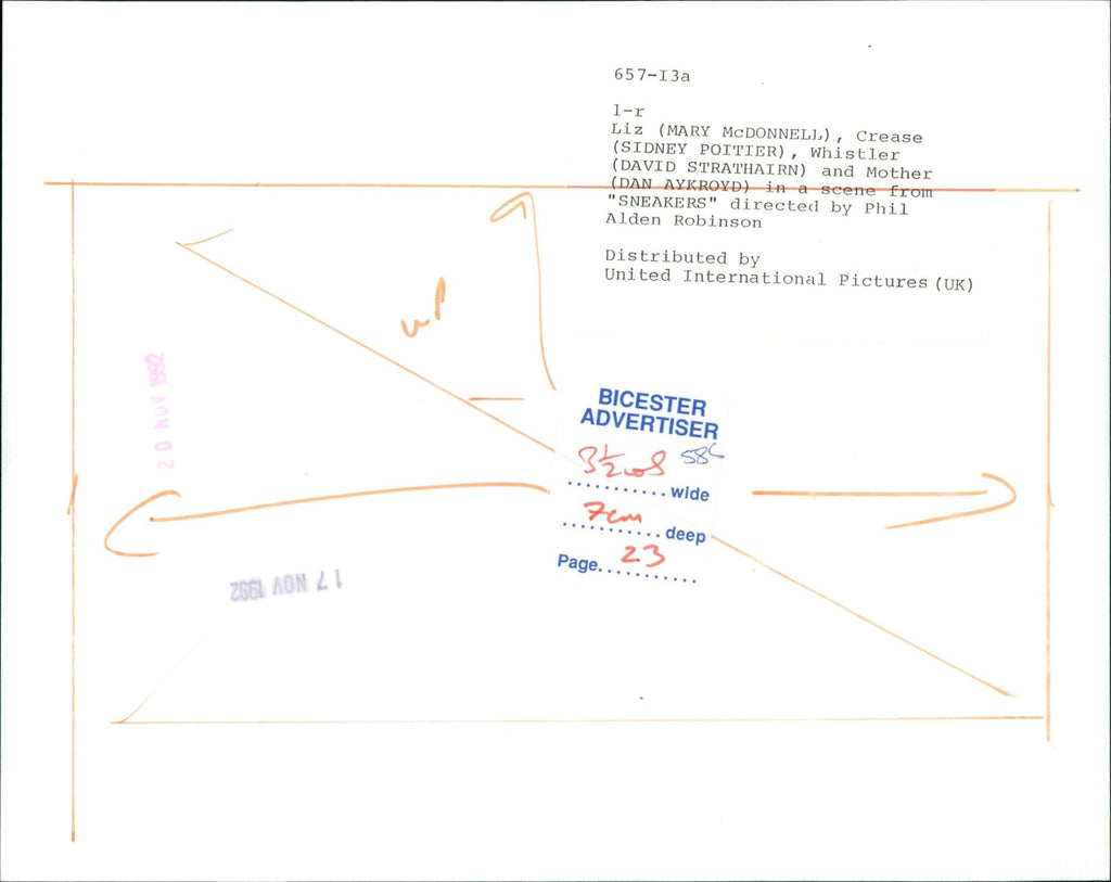 Four actors, Mary McDonnell, Sidney Poitier, David Strathairn, and Dan Aykroyd, are featured in this press photograph from the 1992 film "Sneakers". The film was directed by Phil Alden Robinson and distributed by United International Pictures (UK). Four actors, Mary McDonnell, Sidney Poitier, David Strathairn, and Dan Aykroyd, are featured in this press photograph from the 1992 film "Sneakers". The film was directed by Phil Alden Robinson and distributed by United International Pictures (UK).