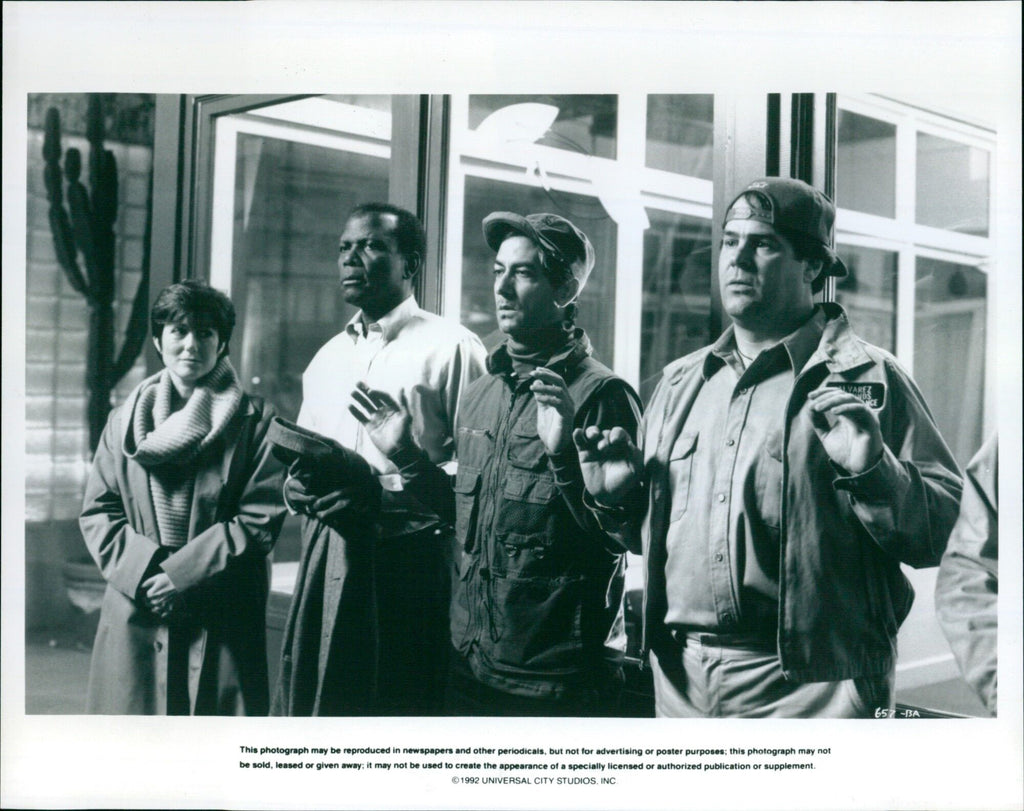 Mary McDonnell, Sidney Poitier, David Strathairn, and Dan Aykroyd in a scene from the film "Sneakers". - Vintage Photograph