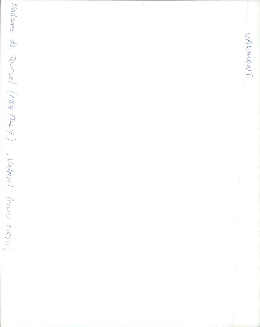 Actors Meg Tilly and Colin Firth are seen on the set of the 1989 film Valmont, an adaptation of the 1782 novel Les Liaisons dangereuses. Tilly plays the character Madame de Tourvel and Firth plays the character Valmont. Actors Meg Tilly and Colin Firth are seen on the set of the 1989 film Valmont, an adaptation of the 1782 novel Les Liaisons dangereuses. Tilly plays the character Madame de Tourvel and Firth plays the character Valmont.