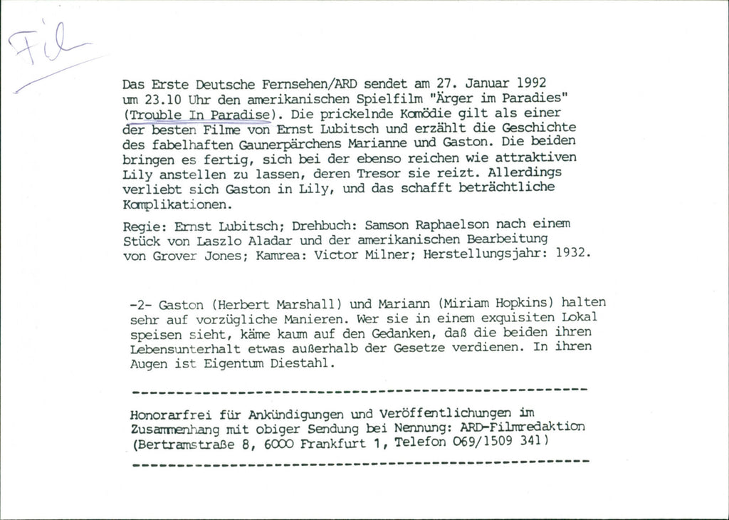 English: Miriam Hopkins as Marianne and Herbert Marshall as Gaston in a scene from the movie "Trouble in Paradise". Dutch: Miriam Hopkins als Marianne en Herbert Marshall als Gaston in een scène uit de film "Trouble in Paradise". English: Miriam Hopkins as Marianne and Herbert Marshall as Gaston in a scene from the movie "Trouble in Paradise". Dutch: Miriam Hopkins als Marianne en Herbert Marshall als Gaston in een scène uit de film "Trouble in Paradise".