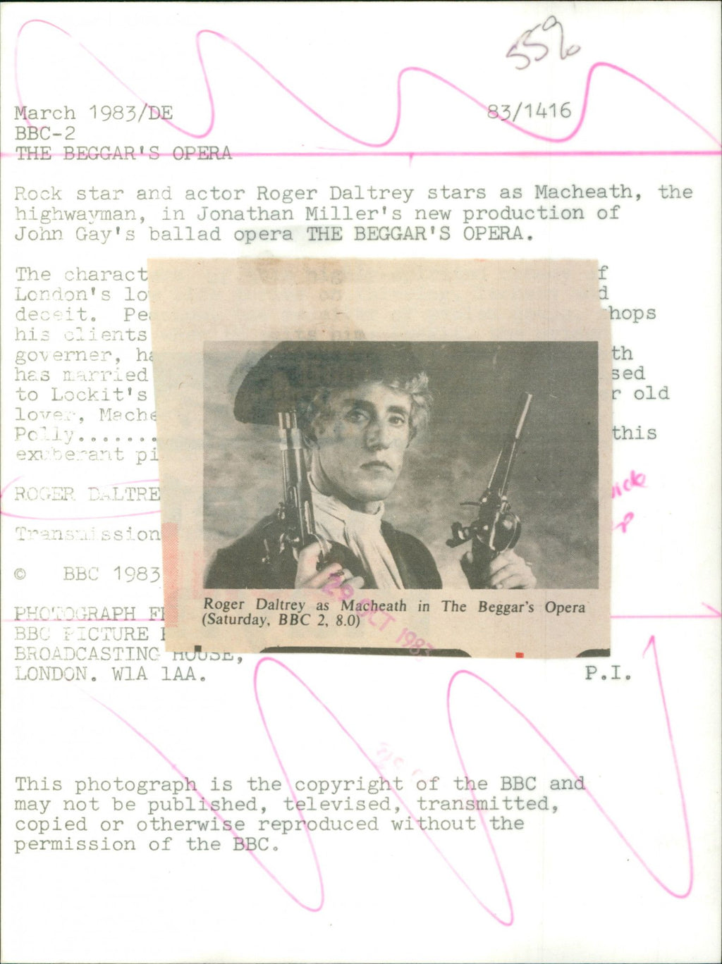 Roger Daltrey as Macheath in "The Beggar's Opera". Roger Daltrey as Macheath in "The Beggar's Opera".