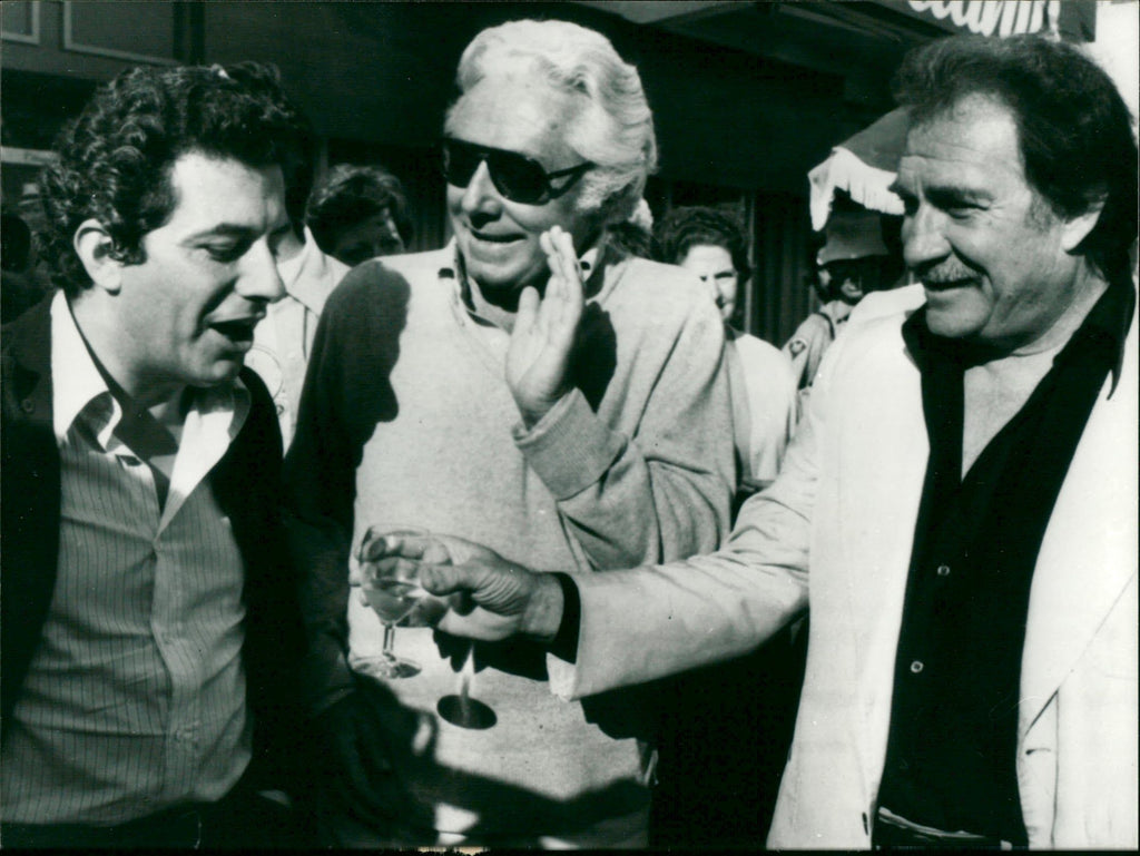 The international film festival, the Italie presents "The Bishop's Room" by Dino Risi. The film Ugo Tognazzi offering a drink to the producer Giovanni Bertolucci (cousin of the director Bertolucci) under the gaze of Dino Risi. The international film festival, the Italie presents "The Bishop's Room" by Dino Risi. The film Ugo Tognazzi offering a drink to the producer Giovanni Bertolucci (cousin of the director Bertolucci) under the gaze of Dino Risi.