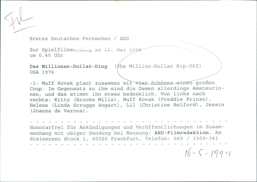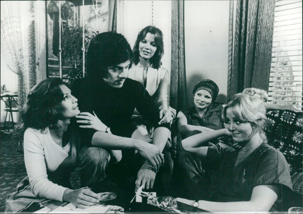 English: The 1976 movie "The Million Dollar Rip-Off. Muff Kovak and four women are plotting something. Unlike him, however, the ladies are amateurs, and that makes him a little wary. From left to right: (Kitty (Brooke Mills), Muff Kovak (Freddie Prinze), Helene (Linda Scruggs Bogart), Lil (Christine Belford), Jessie (Joanna de Varona). Dutch: De film "The Million Dollar Rip-Off uit 1976. Muff Kovak en vier vrouwen zijn iets aan het beramen. In tegenstelling tot hem zijn de dames echter amateurs, en dat maakt hem een beetje op zijn hoede. Van links naar rechts: (Kitty (Brooke Mills), Muff Kovak (Freddie Prinze), Helene (Linda Scruggs Bogart), Lil (Christine Belford), Jessie (Joanna de Varona). English: The 1976 movie "The Million Dollar Rip-Off. Muff Kovak and four women are plotting something. Unlike him, however, the ladies are amateurs, and that makes him a little wary. From left to right: (Kitty (Brooke Mills), Muff Kovak (Freddie Prinze), Helene (Linda Scruggs Bogart), Lil (Christine Belford), Jessie (Joanna de Varona). Dutch: De film "The Million Dollar Rip-Off uit 1976. Muff Kovak en vier vrouwen zijn iets aan het beramen. In tegenstelling tot hem zijn de dames echter amateurs, en dat maakt hem een beetje op zijn hoede. Van links naar rechts: (Kitty (Brooke Mills), Muff Kovak (Freddie Prinze), Helene (Linda Scruggs Bogart), Lil (Christine Belford), Jessie (Joanna de Varona).