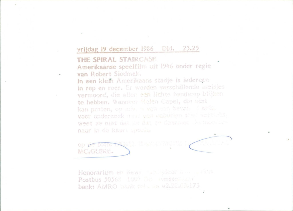 ENG: The Spiral Staircase is a 1946 American psychological horror film directed by Robert Siodmak and starring Dorothy McGuire, George Brent DUTCH: The Spiral Staircase is een Amerikaanse psychologische horrorfilm uit 1946, geregisseerd door Robert Siodmak en met in de hoofdrollen Dorothy McGuire, George Brent. ENG: The Spiral Staircase is a 1946 American psychological horror film directed by Robert Siodmak and starring Dorothy McGuire, George Brent DUTCH: The Spiral Staircase is een Amerikaanse psychologische horrorfilm uit 1946, geregisseerd door Robert Siodmak en met in de hoofdrollen Dorothy McGuire, George Brent.