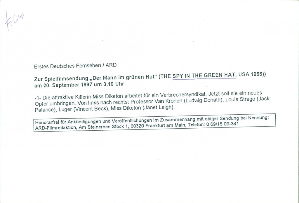 ENG: The Spy in the Green Hat: Directed by Joseph Sargent. With Jack Palance, Janet Leigh, Ludwig Donath, Vincent beck. DUTCH: De spion met de groene hoed: geregisseerd door Joseph Sargent. Met Jack Palance, Janet Leigh, Ludwig Donath, Vincent Beck. ENG: The Spy in the Green Hat: Directed by Joseph Sargent. With Jack Palance, Janet Leigh, Ludwig Donath, Vincent beck. DUTCH: De spion met de groene hoed: geregisseerd door Joseph Sargent. Met Jack Palance, Janet Leigh, Ludwig Donath, Vincent Beck.
