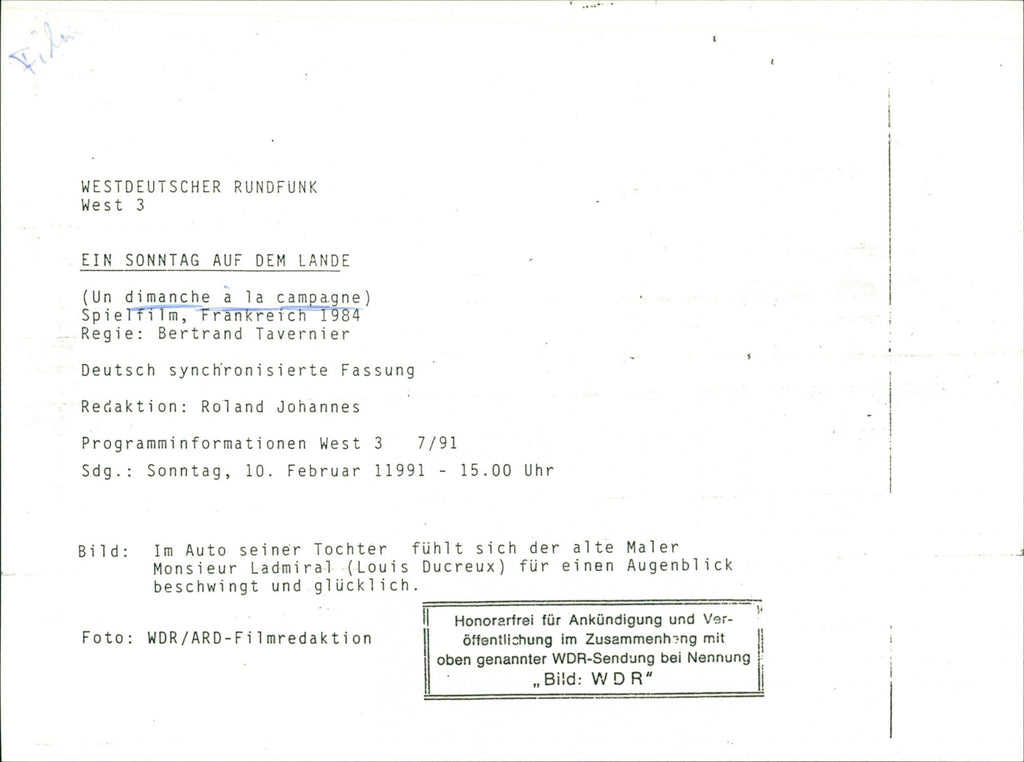 ENG: Un dimanche à la campagne directed by Bertrand Tavernier starring Louis Ducreux DUTCH: Un dimanche à la campagne geregisseerd door Bertrand Tavernier met in de hoofdrol Louis Ducreux ENG: Un dimanche à la campagne directed by Bertrand Tavernier starring Louis Ducreux DUTCH: Un dimanche à la campagne geregisseerd door Bertrand Tavernier met in de hoofdrol Louis Ducreux