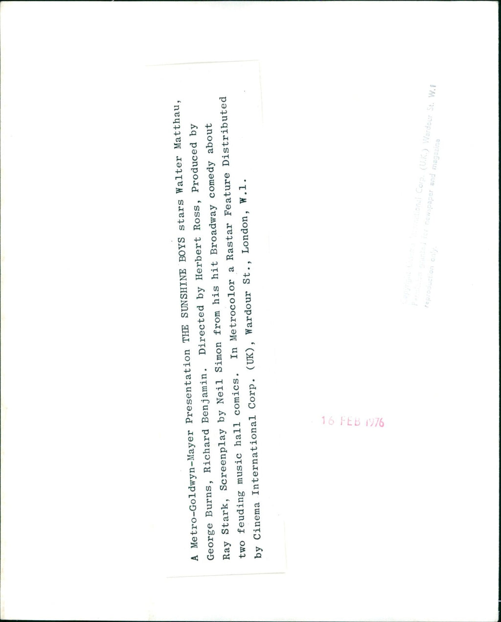 In 1976, Metro-Goldwyn-Mayer released the film adaptation of Neil Simon's hit Broadway comedy, "The Sunshine Boys," starring Walter Matthau and Richard Benjamin. Directed by Herbert Ross and produced by George Burns, Ray Stark, and Richard Benjamin, the movie was released in Metrocolor and distributed by Cinema International Corporation (UK). In 1976, Metro-Goldwyn-Mayer released the film adaptation of Neil Simon's hit Broadway comedy, "The Sunshine Boys," starring Walter Matthau and Richard Benjamin. Directed by Herbert Ross and produced by George Burns, Ray Stark, and Richard Benjamin, the movie was released in Metrocolor and distributed by Cinema International Corporation (UK).