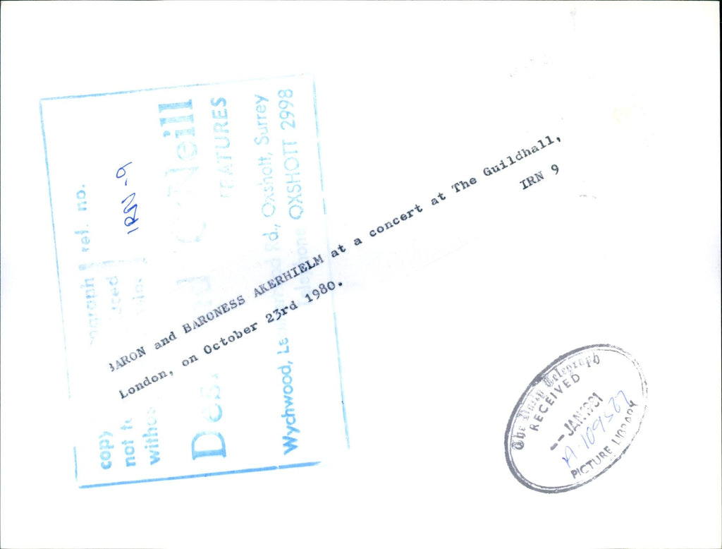 Relno COPY IRN - 9 not ? with Londo D on Octob. Wychwood , Le d . , Oxsholt , Surrey OOXSHOTT 2998 23rd 1980 3 ARON and BARONESS AKERHIELM at a concert at The Guildhall. Relno COPY IRN - 9 not ? with Londo D on Octob. Wychwood , Le d . , Oxsholt , Surrey OOXSHOTT 2998 23rd 1980 3 ARON and BARONESS AKERHIELM at a concert at The Guildhall.