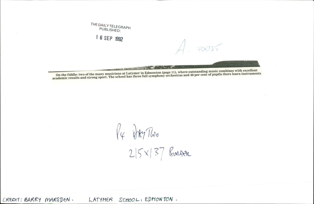 40 per cent of pupils at Latymer in Edmonton learn instruments. The school has three full symphony orchestras and three full orchestras. The music combines with excellent academic results and strong sport. - THE DAILY TELEGRAPH PUBLISHED : 1 6 SEP 1992 A 40035 On the fiddle : two of the many musicians atLatymer. 40 per cent of pupils at Latymer in Edmonton learn instruments. The school has three full symphony orchestras and three full orchestras. The music combines with excellent academic results and strong sport. - THE DAILY TELEGRAPH PUBLISHED : 1 6 SEP 1992 A 40035 On the fiddle : two of the many musicians atLatymer.