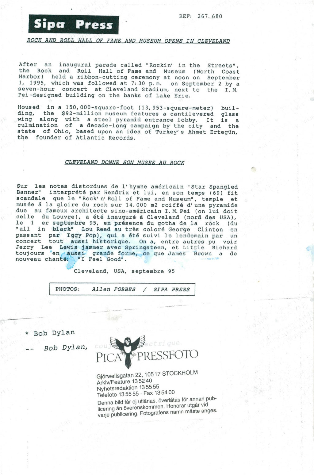 Bob Dylan during a show in connection with the opening of the Rock and Roll Hall of Fame and Museum. Bob Dylan, musician, guitarist, Nobel Prize winner, foreign artists