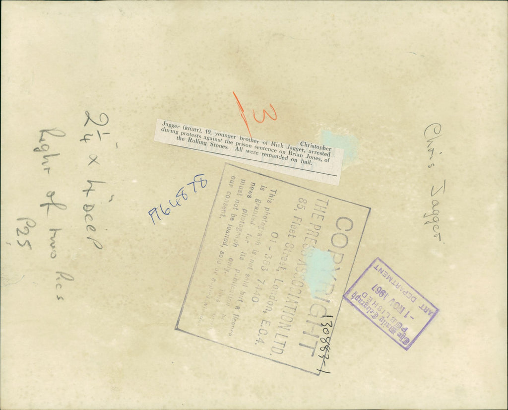 Singer Chris Jagger arrested during protests against the prison sentence on Brian Jones, of the Rolling Stones. --- Chris Jagger is an English musician. He is the younger brother of the Rolling Stones' frontman, Mick Jagger. Singer Chris Jagger arrested during protests against the prison sentence on Brian Jones, of the Rolling Stones. --- Chris Jagger is an English musician. He is the younger brother of the Rolling Stones' frontman, Mick Jagger.
