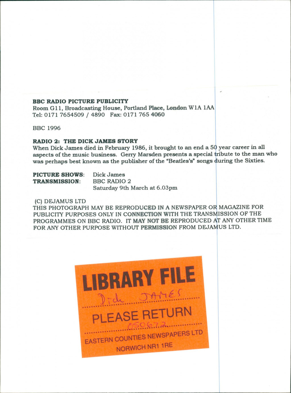 Dick James, born Leon Isaac Vapnick in the East End of London, was a British music publisher and singer and, together with his son Stephen, founded the DJM record label and recording studios, as well as the Beatles' publisher Northern Songs. Dick James, born Leon Isaac Vapnick in the East End of London, was a British music publisher and singer and, together with his son Stephen, founded the DJM record label and recording studios, as well as the Beatles' publisher Northern Songs.
