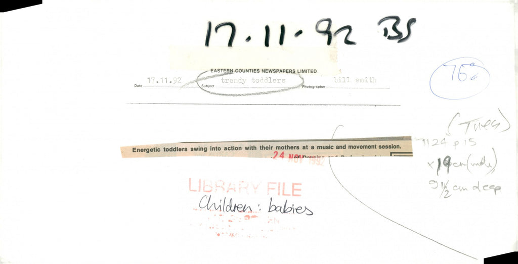 Energetic toddlers swing into action with their mothers at a music and movement session. - Vintage Photograph