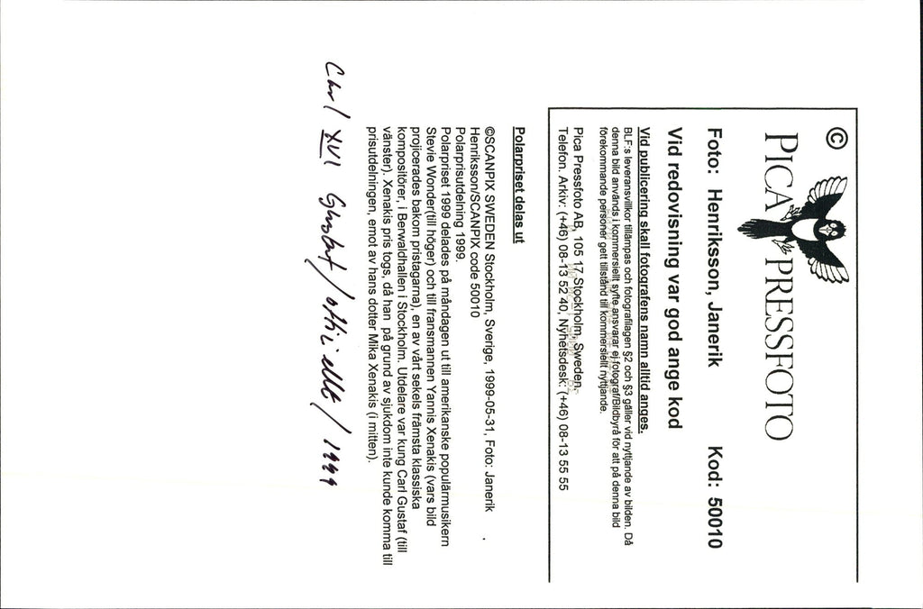King Carl Gustaf handles the Polar Prize to the musician Stevie Wonder in the Berwald Hall - Vintage Photograph