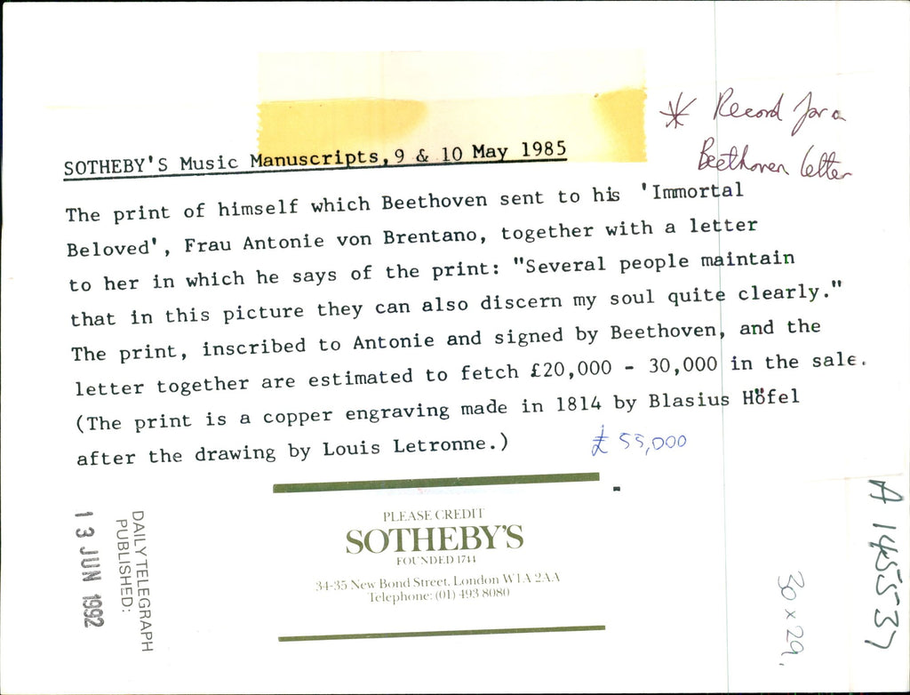 The print of himself which Beethoven sent to his 'Immortal Beloved', Frau Antonie von Brentano, together with a letter to her. The print of himself which Beethoven sent to his 'Immortal Beloved', Frau Antonie von Brentano, together with a letter to her.