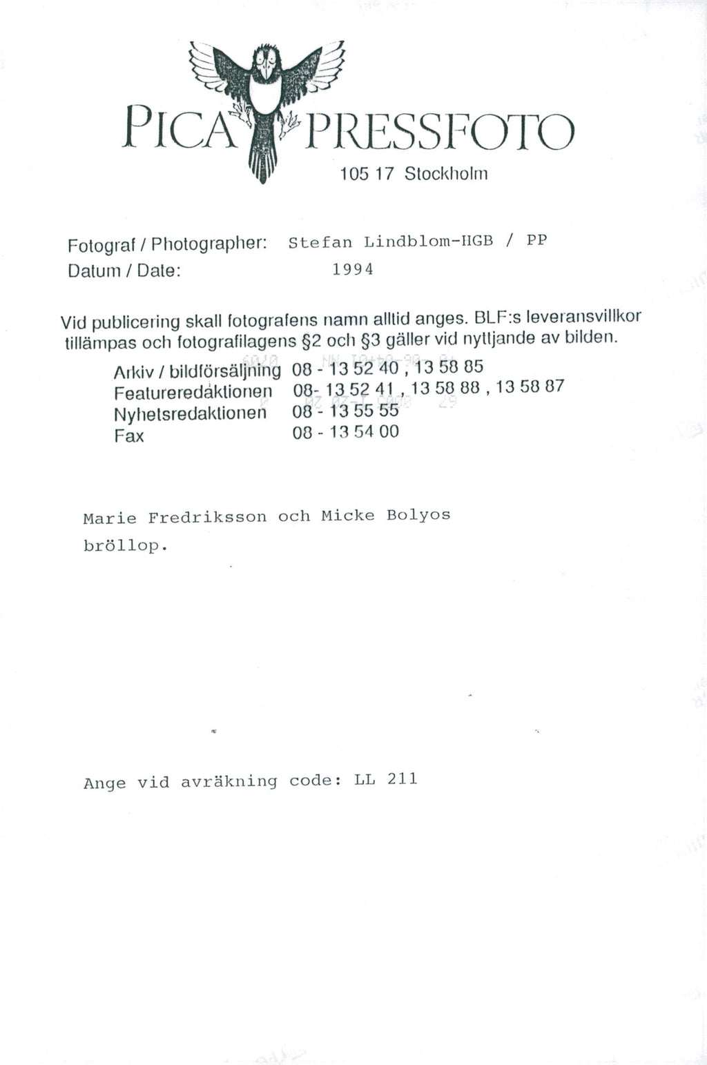 Marie Fredriksson, actually Gun-Marie Bolyos, born Fredriksson May 30, 1958 in East Ljungby in Skåne, is a Swedish singer and songwriter. In 1986 she formed the Swedish pop duo Roxette together with Per Gessle. Marie Fredriksson and Micke Bolyo's wedding. Marie Fredriksson, actually Gun-Marie Bolyos, born Fredriksson May 30, 1958 in East Ljungby in Skåne, is a Swedish singer and songwriter. In 1986 she formed the Swedish pop duo Roxette together with Per Gessle. Marie Fredriksson and Micke Bolyo's wedding.
