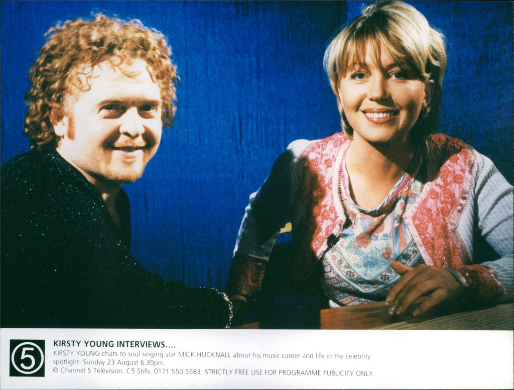 Mick Hucknall and Kirsty Young: Kirsty Young chats to soul singer star Mick Hucknall about his music career and life in the celebrity spotlight, Channel 5. Mick Hucknall and Kirsty Young: Kirsty Young chats to soul singer star Mick Hucknall about his music career and life in the celebrity spotlight, Channel 5.