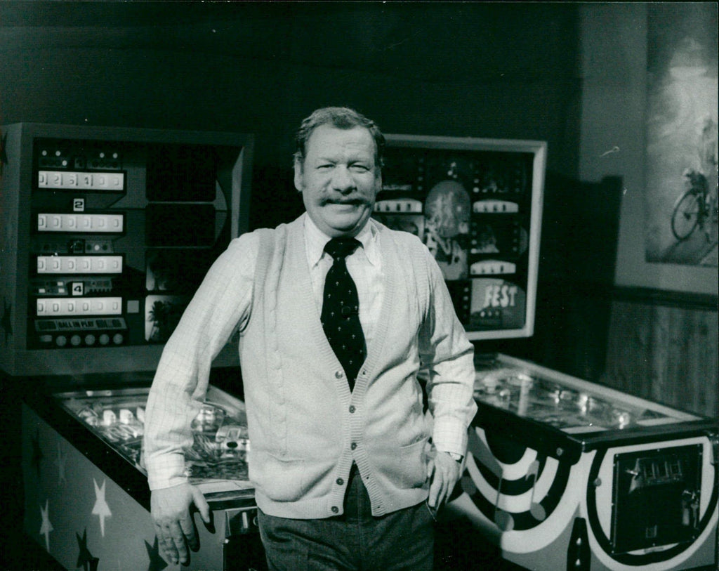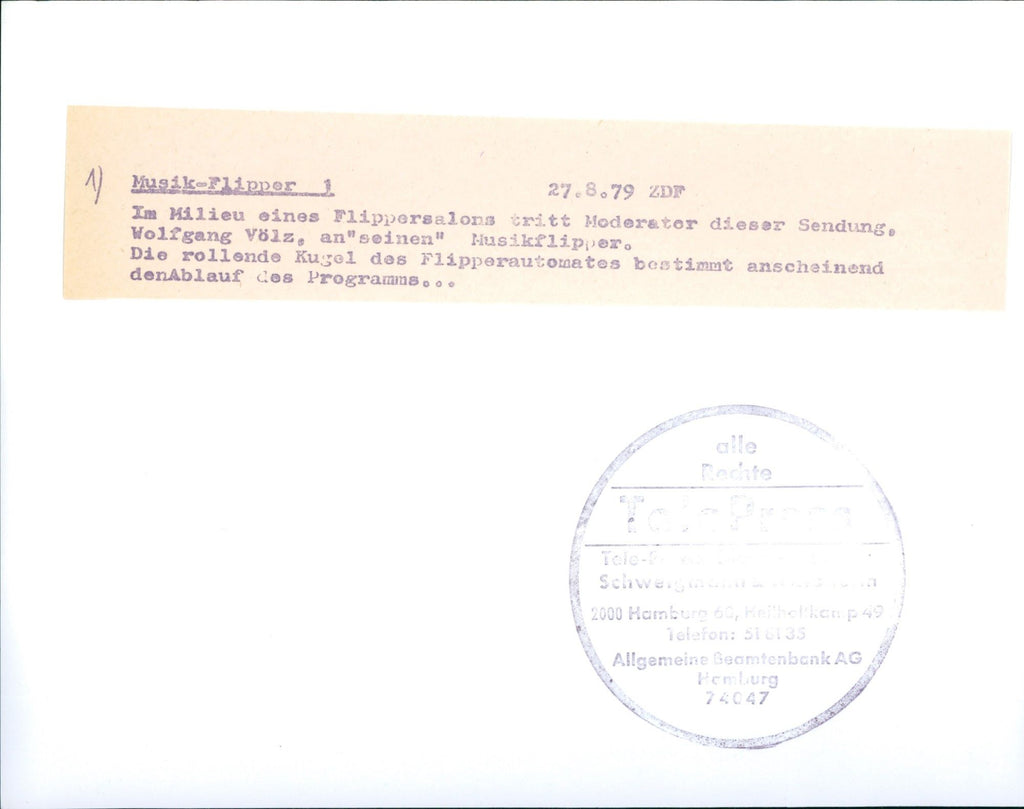 The ZDF program "Musik-Flipper": In the milieu of a pinball salon, the presenter of this program, Wolfgang Völz, steps on "his" music pinball machine. The rolling ball of the pinball machine apparently determines the course of the program ... Die ZDF-Sendung "Musik-Flipper": Im Milieu eines Flippersalons tritt der Moderator dieser Sendung, Wolfgang Völz, an "seinen" Musikflipper. Die rollende Kugel des Flipperautomaten bestimmt anscheinend den Ablauf des Programms...