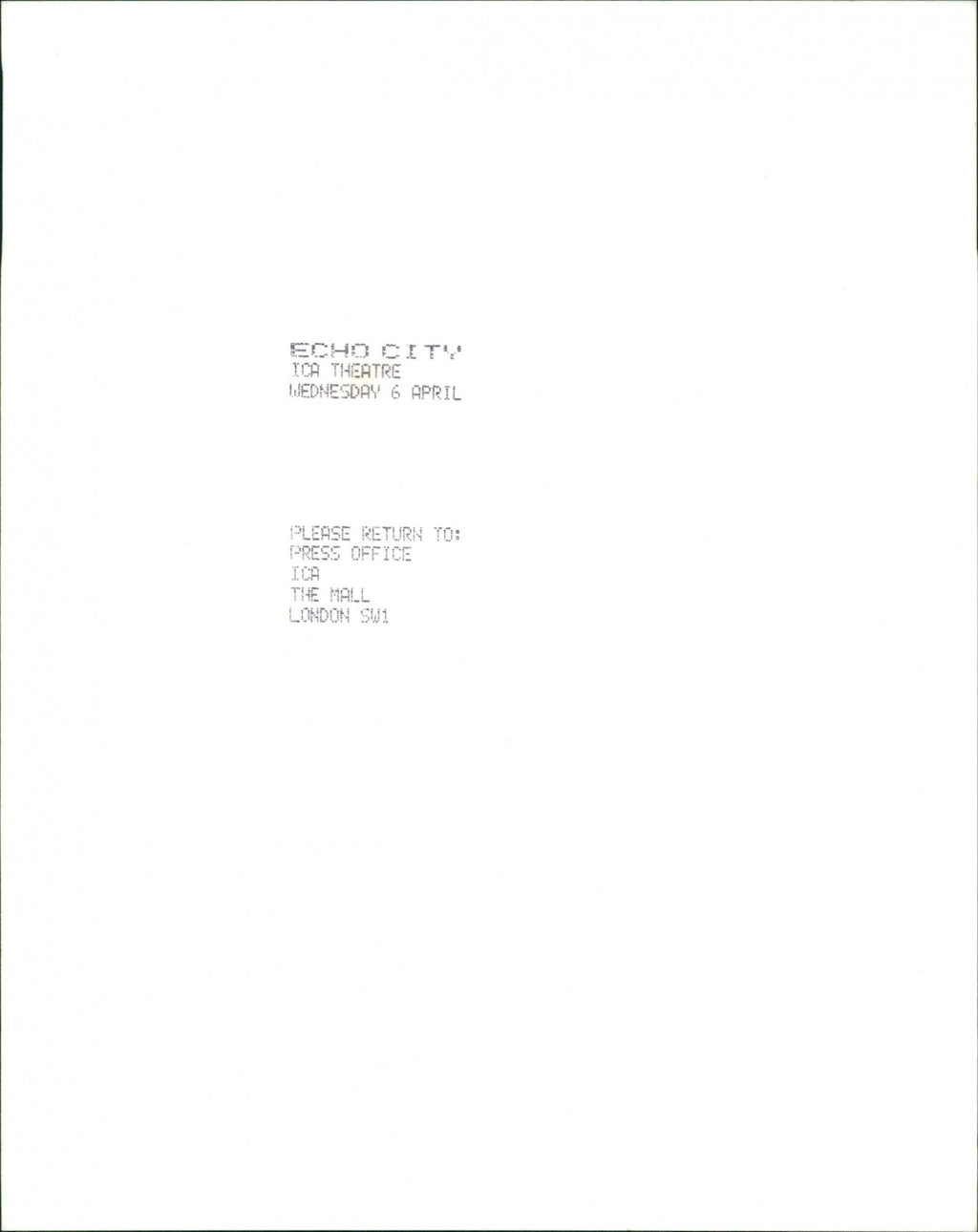 Echo City is a British sound sculpture and music project founded in London in 1983 by Guy Evans, Giles Leaman, and Giles Perring. Musical group 'Echo City' artists together Echo City is a British sound sculpture and music project founded in London in 1983 by Guy Evans, Giles Leaman, and Giles Perring. Musical group 'Echo City' artists together