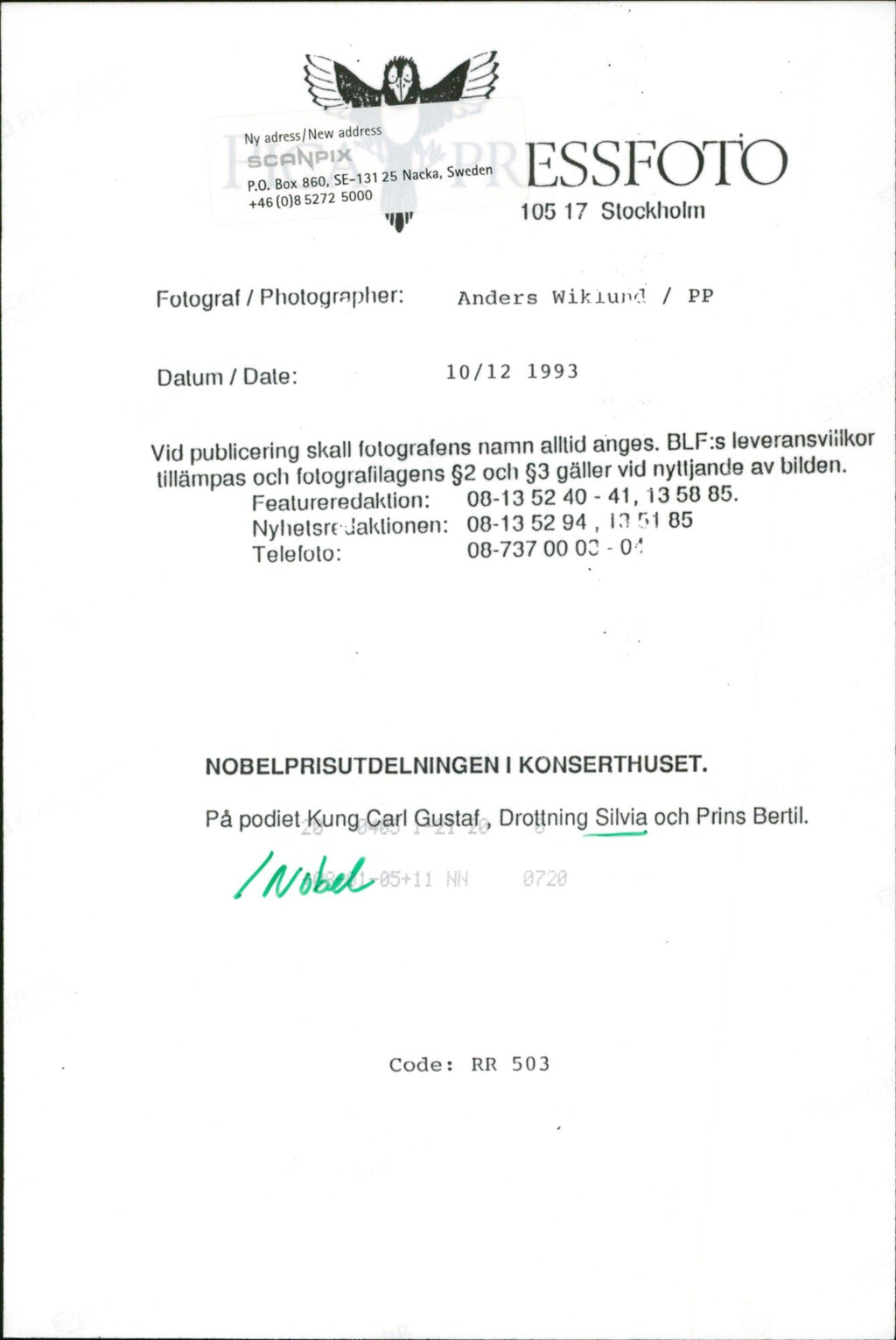 Nobel prize ceremony in the concert hall. On the stage King Carl Gustaf, Queen Silvia and Prince Bertil - Vintage Photograph